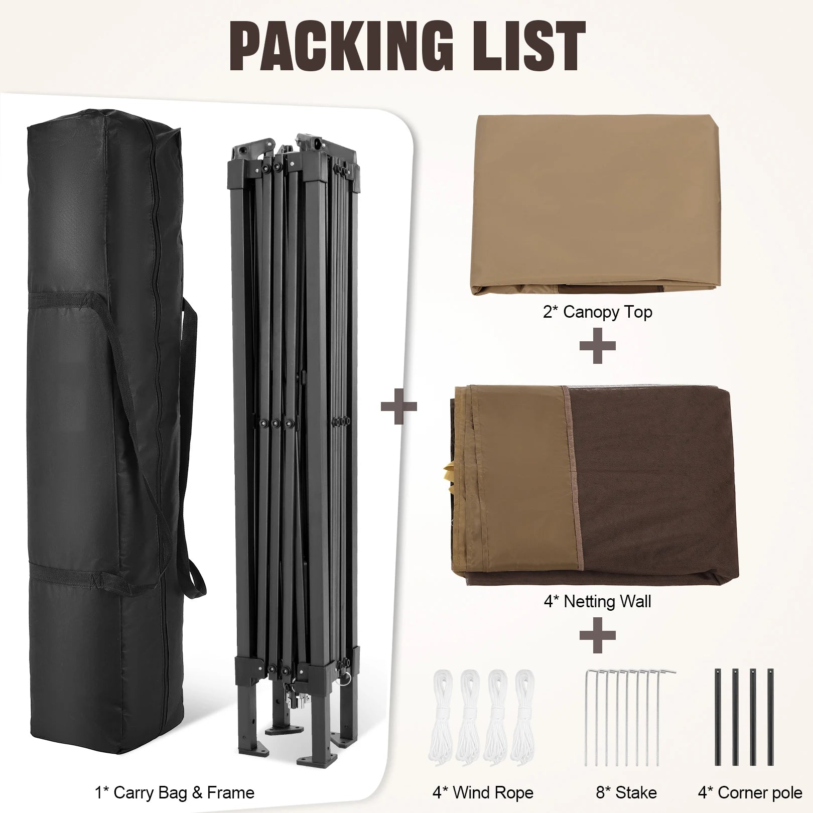 - Complete packing list — includes canopy top, four zipper mesh panels, stakes, ropes, sandbags, adjustable metal frame, and durable storage bags for easy, all-in-one delivery.