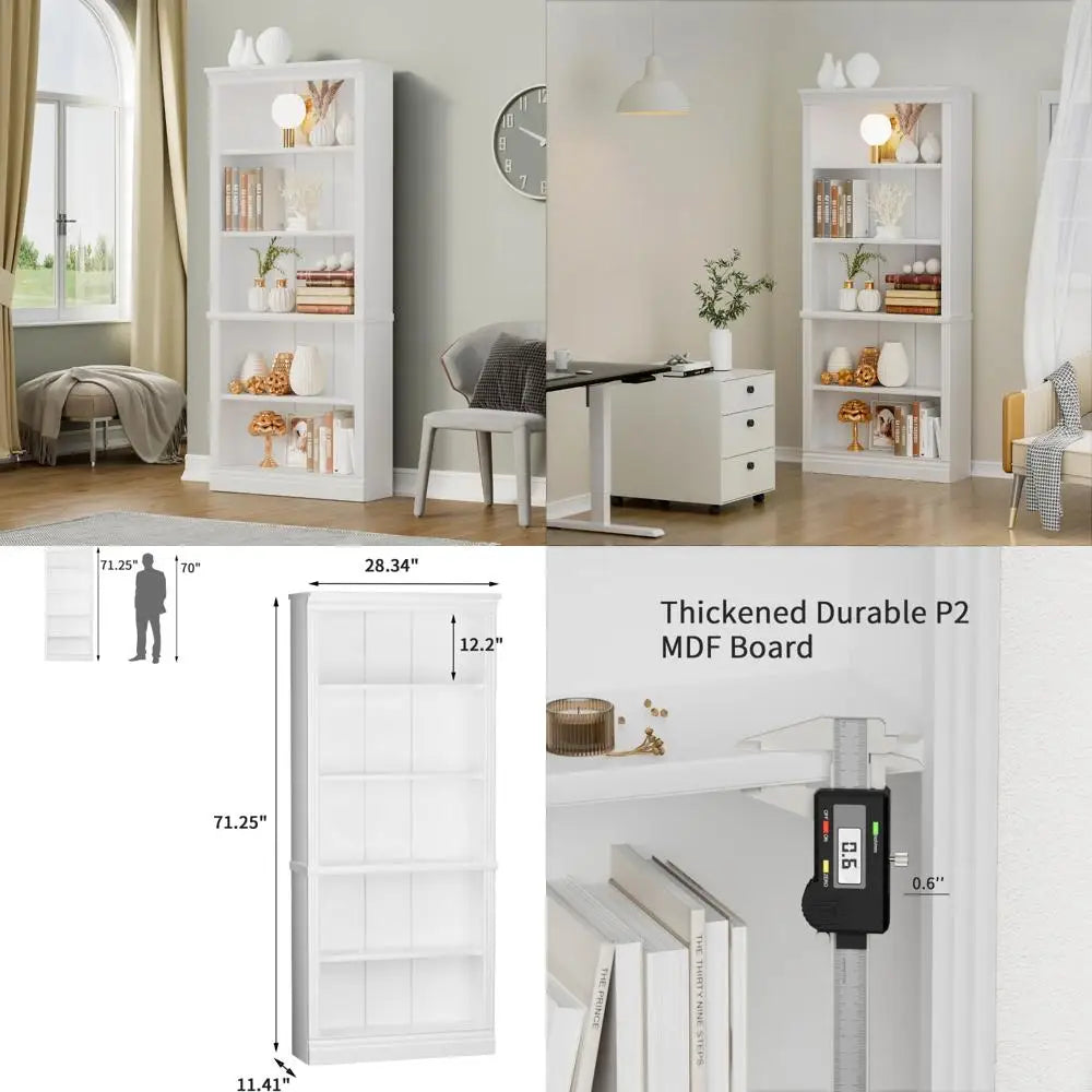 - Five spacious shelves provide ample room for books, photo frames, and decorative accents.