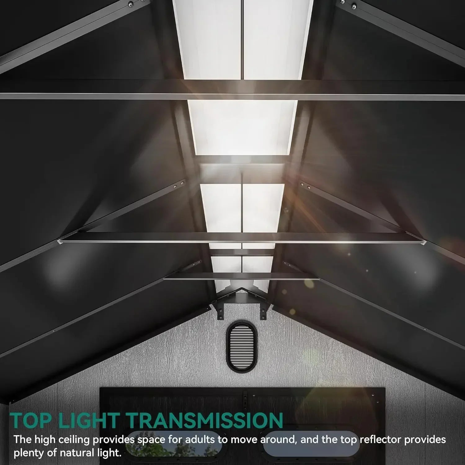 Designed for all-season usability, this shed is engineered to withstand fading, corrosion, water, and UV exposure, ensuring long-lasting beauty and performance in diverse weather conditions. The 16mm thick double-layer resin panels resist warping and cracking, while the sloped roof channels water away for extended durability.
