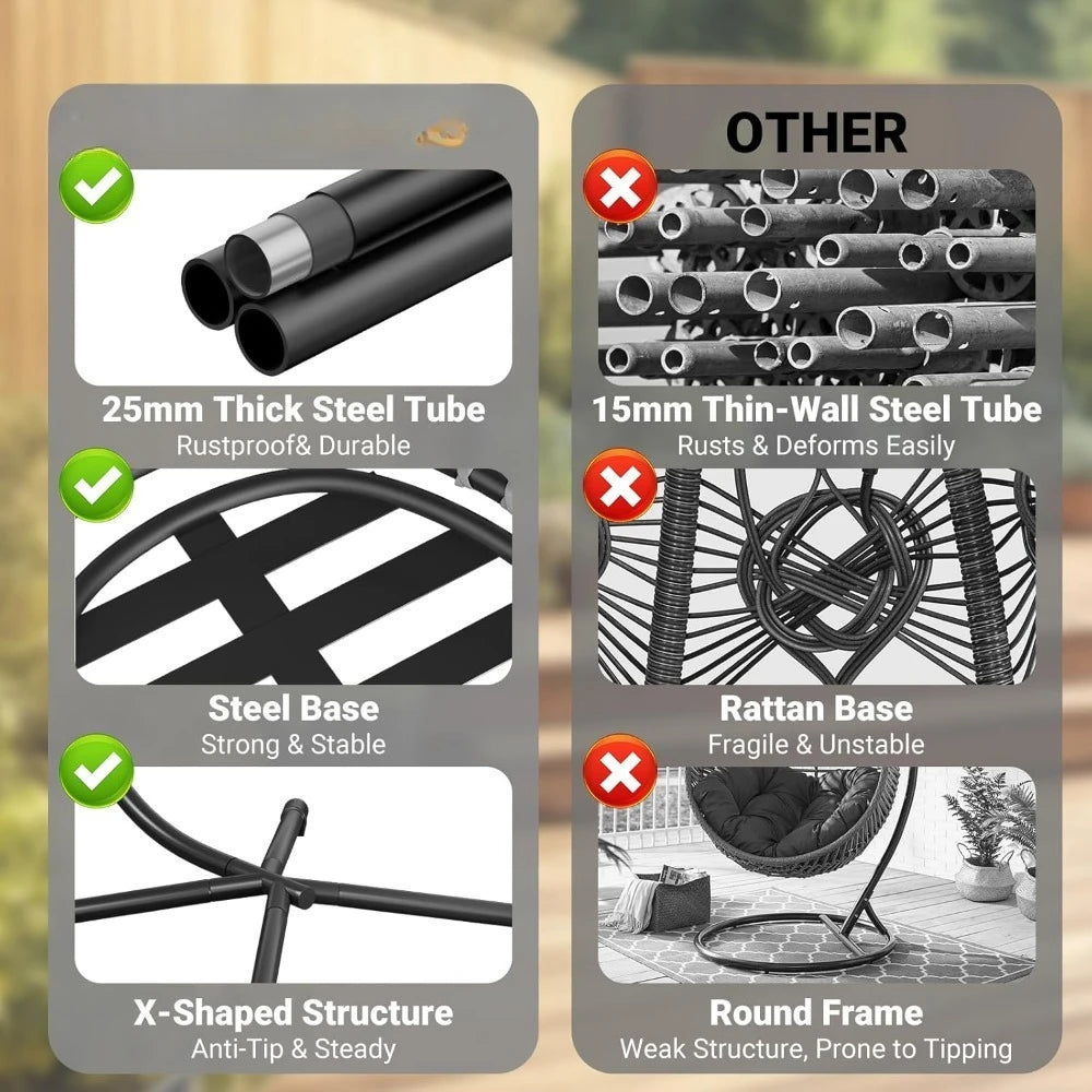 - Sturdy and Durable Construction: Crafted from high-quality waterproof wicker and a heavy-duty aluminum steel frame, this egg chair is built to withstand the elements while holding up to 350 pounds, ensuring long-term reliability.