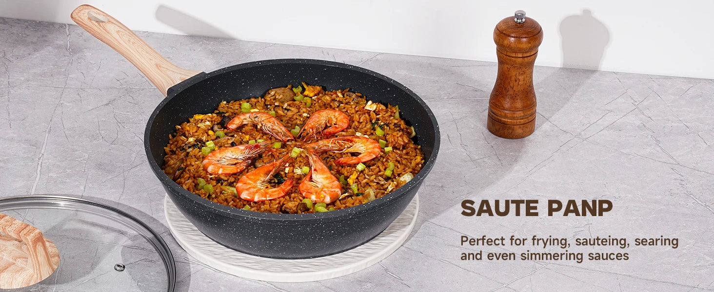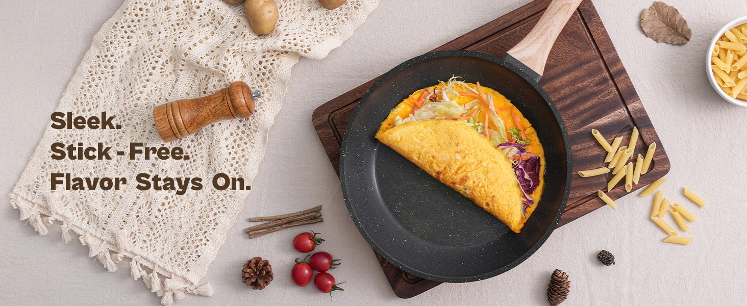 - Granite-style nonstick coating: Superior food release and easy cleanup.
