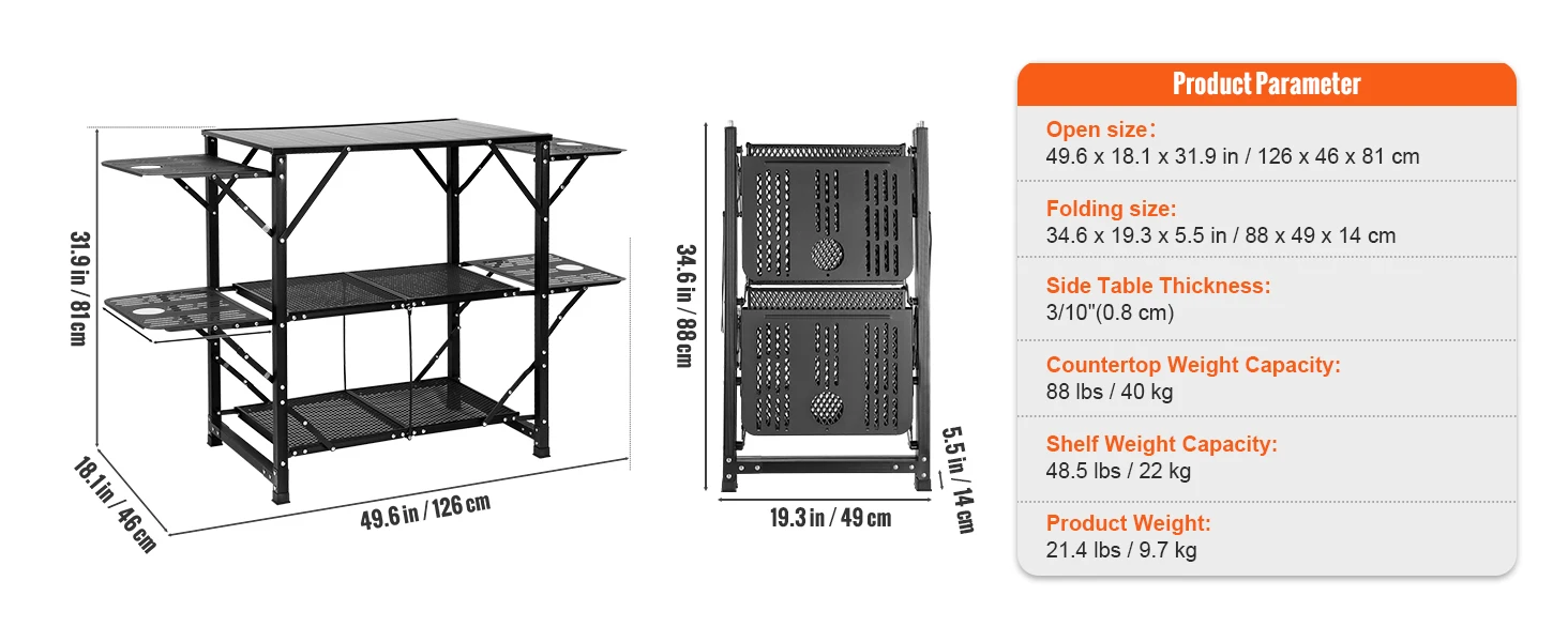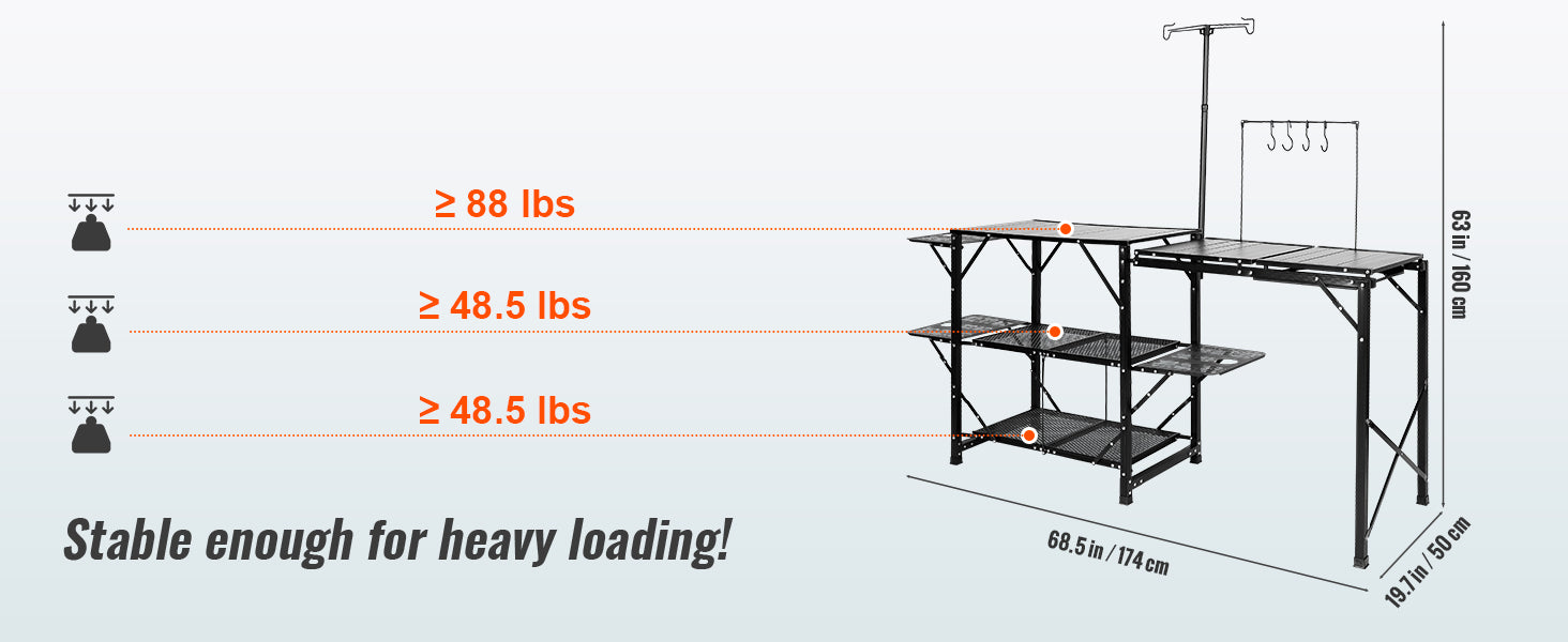 A Load of Stability: The camp kitchen is designed with a reinforced triangular structure, which provides better stability and security during operation. The countertop can handle heavy loads of up to 88 lbs in total. The kitchen has an extended size of 68.5"x19.7"x 63" and a compact size of 34.3"x20.9"x6.7".