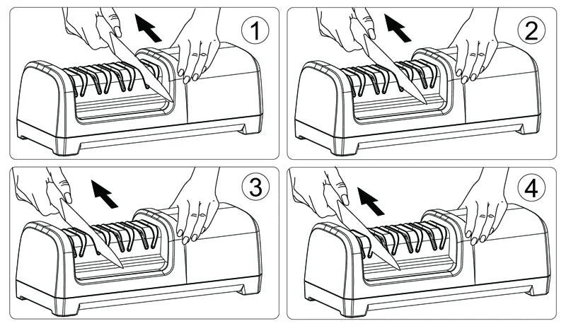 - Choose the appropriate slot based on the knife’s dullness (coarse for blunt blades, fine for daily maintenance, polishing for a brighter edge).