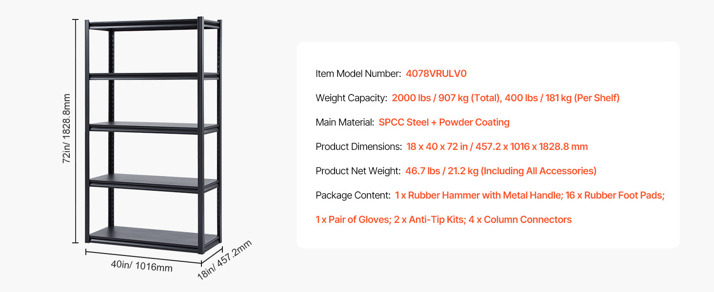 5‑tier storage rack, locking shelf clips, rubber hammer, and gloves for easy assembly.