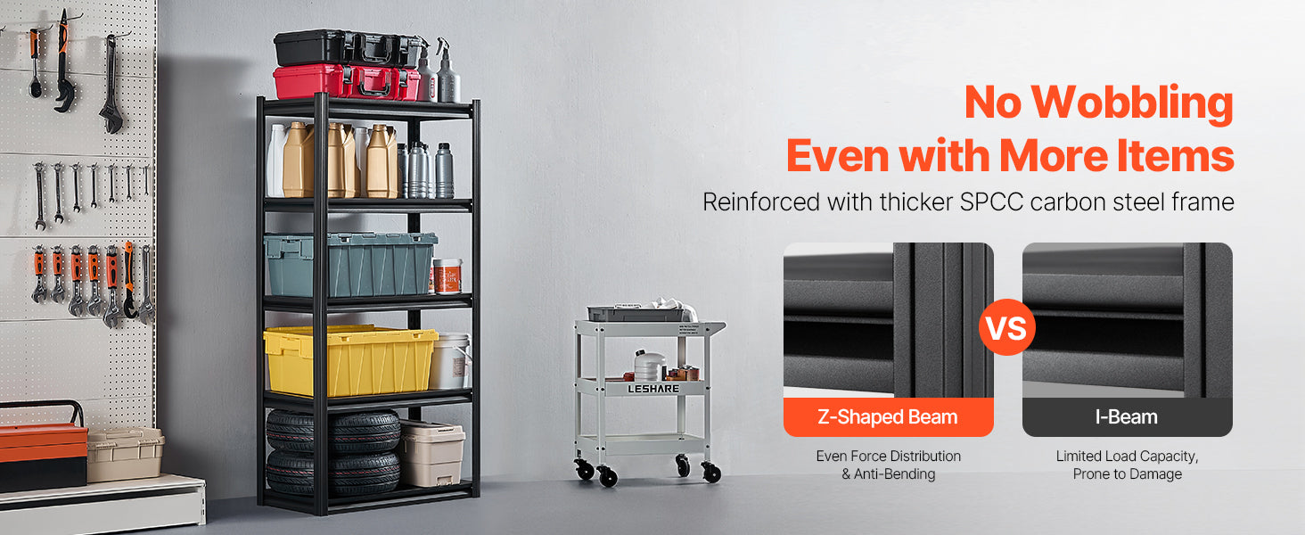 Constructed from SPCC carbon steel and finished with a rugged powder coating, these shelves resist rust, scratches, and daily wear. The result is a durable storage system built to stand up to garage dust, humidity, and busy workdays.