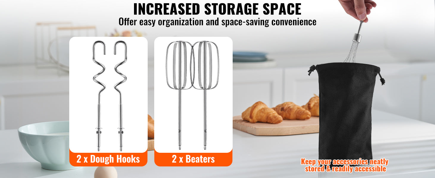 Our hand mixer electric handheld comes with a convenient storage bag, providing a dedicated space to keep all your attachments organized. Say goodbye to the frustration of misplaced accessories.